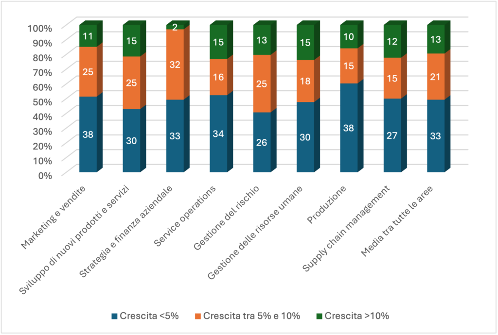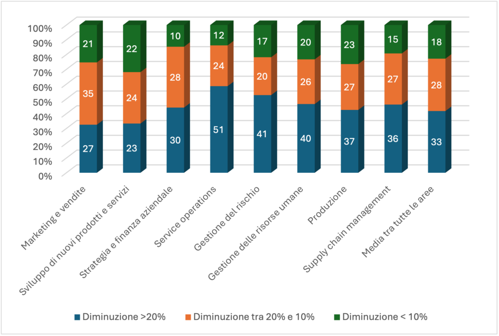 Dalle statistiche a disposizione si nota una significativa riduzione dei costi per ciascuna area aziendale in cui l’intelligenza artificiale viene impiegata. A livello complessivo, si evince come nella maggior parte dei casi, ovvero il 33% considerando il valore medio, il decremento è superiore al 20%, mentre, sempre prendendo come riferimento la media, soltanto nel 18% del totale si riscontra una diminuzione inferiore al 10%. Di conseguenza, si può affermare che l’impatto dell’intelligenza artificiale sulla riduzione costi è superiore rispetto a quello esercitato sulla crescita ricavi, dato che la diminuzione percentuale delle spese è più elevata rispetto all’aumento percentuale delle entrate. Scendendo nel dettaglio, le aree organizzative che beneficiano maggiormente di questo vantaggio sono quelle relative alla produzione e al service operations, mentre quella in cui si hanno i minori effetti è l’area deputata alla strategia e alla finanza. Nonostante ciò, anche questo reparto ottiene benefici significativi, visto che nel 30% dei casivi è una riduzione maggiore del 20% in termini di costi.